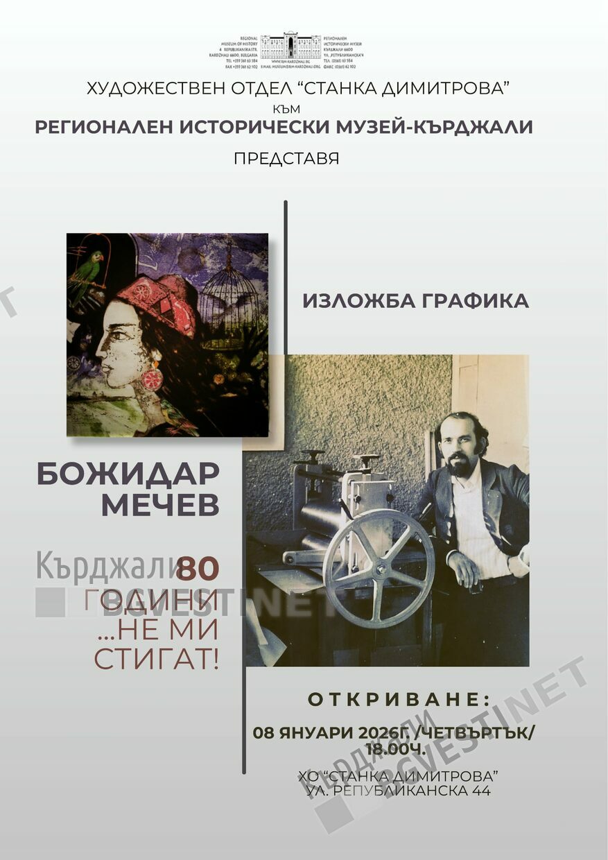 Известният български художник Бажидар Мечев открива самостоятелна изложба в Кърджали във връзка със 80-годишния си юбилей.Творбите му ще бъдат представени в художествената галерия „Станка Димитрова“на 8 януари т.г.,когато е рождения му ден.Изложбата е под наслов „80-години не ми стигат“.