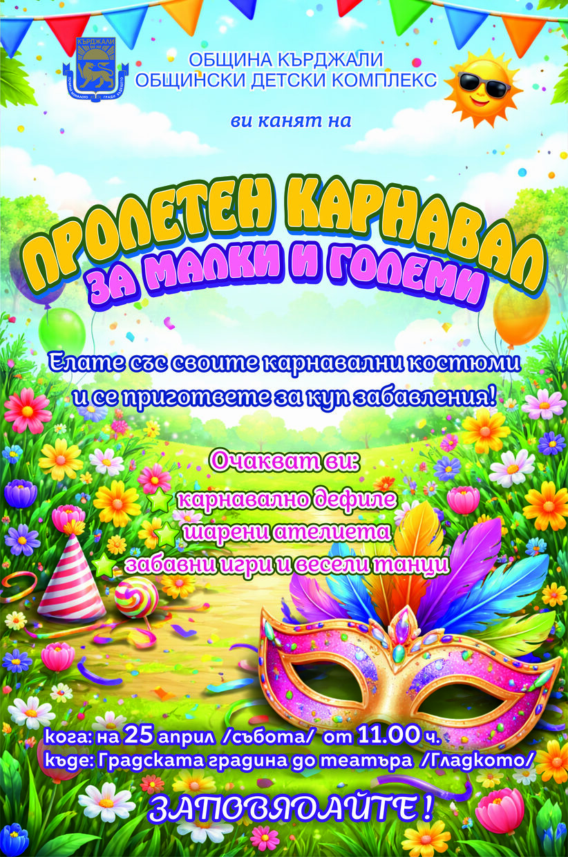 Всяка година по традиция  Община Кърджали и ЦПЛР-Общински детски комплекс гр.Кърджали организират ДЕТСКИ ПРОЛЕТЕН КАРНАВАЛ. Тази година той ще се проведе на 25 април /събота/, от 11.00 ч. в Градската градина, до театъра /Гладкото/ и ще има свободен формат.