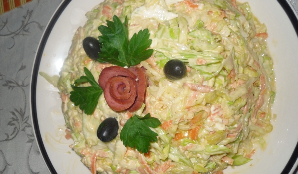 Накълцайте ситно зелето, посолете го на око и го намачкайте. Настържете морковите на ситно ренде и ги разбъркайте към зелето в купа. Добавете малко олио и оцет и объркайте салата с майонезата. Подн...