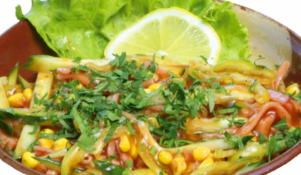Морковите се нарязват на тънки ивици, заливат се с оцет и се оставят за половин час. Отцеждат се и се добавя лютият пипер, захарта, и соевият сос, смесен предварително с водата. Лукът се нарязва на е...