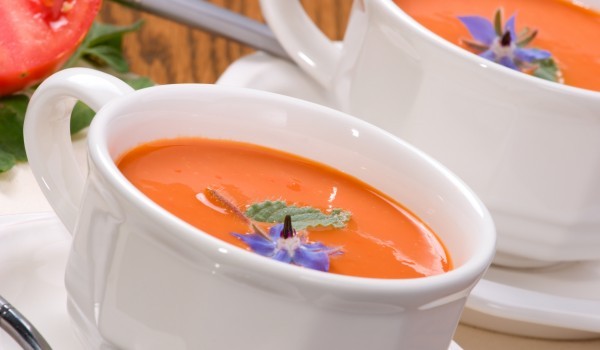 Доматите нарежете на парченца. Варете ги 10 мин и пасирайте. Настържете лука и го задушете заедно с чесъна с масло. Посипете с брашно, добавете разтрошеното кубче бульон и разбъркайте. Прибавете вод...