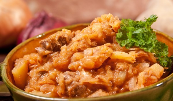 Нарязаният бекон леко се запържва в тиган. Добавят се нарязаните на кръгчета лук и месото на парчета. Запържва се до златисто. Прибавя се едро нарязаното зеле и се разбърква. Задушава се на слаб огън...