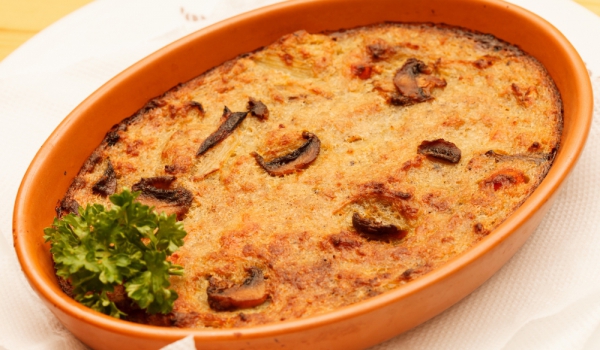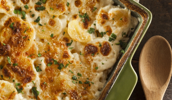 Нарежете картофите на филии и ги полусварете във вряща подсолена вода с малко олио. Запържете брашното в 100 мл олио, сипете млякото и бъркайте, докато се получи гладък крем. Дръпнете от огъня и при...