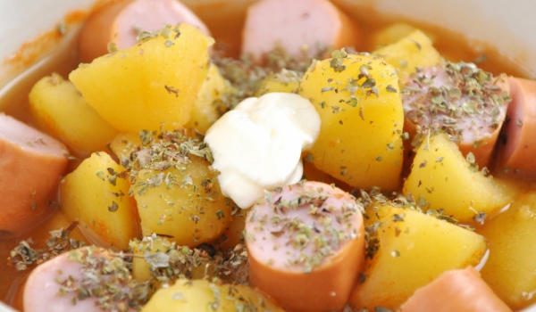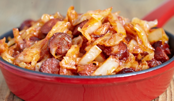 Лукът се нарязва на едри филийки. Набодете наденичките с вилица, Нарежете зелето на ситно и го сварете в два литра подсолена вода с черен пипер. След това го отцедете. Сварете леко наденичките и след...