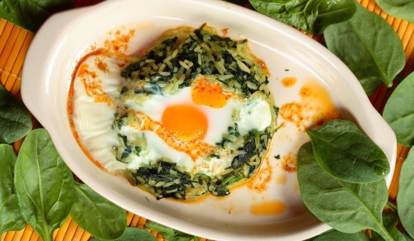 Измийте добре спанака и го сложете в незалепващ съд с малко вода. Добавете на ситно нарязания чесън и задушете докато спанакът омекне. В отделни подходящи купички наредете готовия спанак, прибавете...