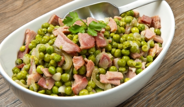 Маслото се разтапя в тиган добавя се нарязаният лук и след като омекне се добавя чесънът. Разбърква се и се добавя грахът, беконът и ментата. Подправете със сол и чер пипер по избор. Сложете капак и о...