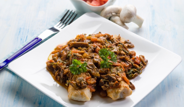 Нарязваме рибата на кубчета (по 5-6 броя за порция) и посоляваме. Овалваме в брашното и след това изпържваме в част от олиото. В останалата мазнина и малко вода задушаваме до омекване ситно нарязания...
