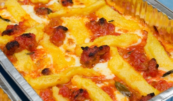 Сипете брашното във врящата, леко подсолена вода и възварете. Разбъркайте добре, намалете огъня и при постоянно бъркане сварете полентата. Оставете я да изстине, изрежете фигури, подредете ги на редо...