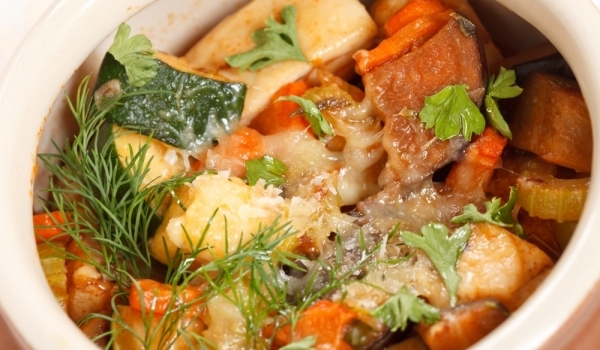 Нарежете морковите на колелца, лука на филийки, а месото на хапки. Задушете ги в олиото. Прибавете последователно нарязаните чушки, розичките карфиол, бланширания зелен фасул, нарязания на кубчета па...