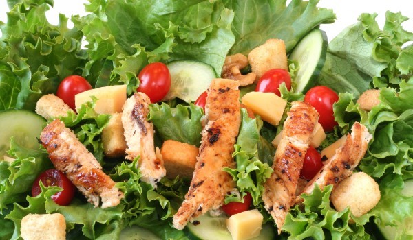 Салатата се измива и нарязва. Пилешкото филе се запича на скара и се нарязва, прибавя се аншоата(по желание). Слага се върху салатата която се поръсва с настърган пармезан и се подправя със зехтина и...