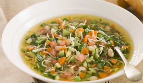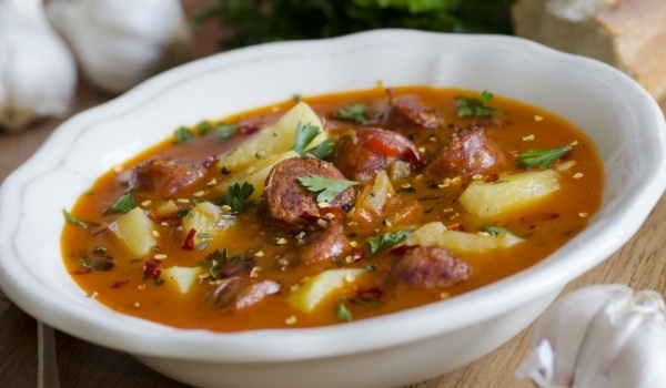 Измитите и вече нарязани зеленчуци запържваме за кратко в олиото. Към тях прибавяме и нарязаната на кубчета наденица, а малко по-късно и червения пипер. Заливаме с вода около 1-1.3 литра, а когато зав...