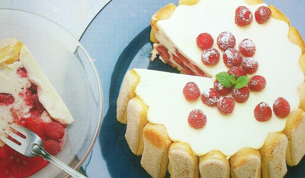 Охладете крем фреша в хладилника и измийте и отцедете в гевгир малините. Накиснете желатина в студената вода. Разполовете ваниловата шушулка, остържете вътрешността с нож и пуснете семките и шушулките...