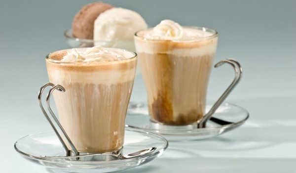 Сварете силно и ароматно кафе - еспресо или шварц. Всички останали съставки сложете в купа и разбийте с миксер. Изсипете кафето във високи чаши, излейте сместа отгоре и сервирайте.