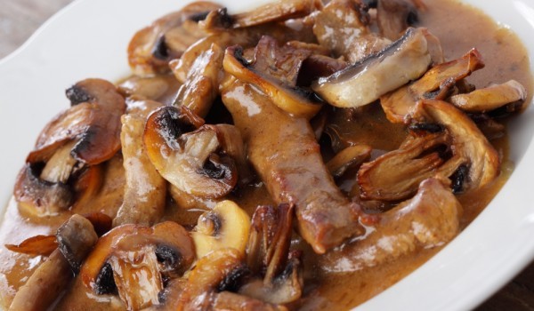 Накиснете предварително гъбите във вода. Нарежете пилешкото на парчета, объркайте го със сол, млян черен пипер и мащерка и оставете да престои. Загрейте маслото на слаб огън и задушете ситно накълцан...