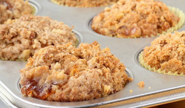 В купа смесете пресятото брашно, овесените ядки, захарта, бакпулвера, солта, ванилията и канелата. Отделно леко затоплете прясното мляко, докато стане хладко и сложете в него маслото да се разтопи. Р...