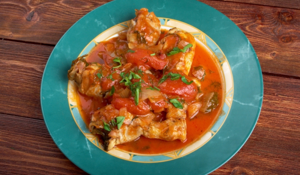Загрейте маслото с 2 с.л. от зехтина и запържете парчетата пиле. Извадете и ги оставете настрана. В същата мазнина запържете чесъна и лука. Добавете брашното и задушете за 1 минута. Добавете доматите...