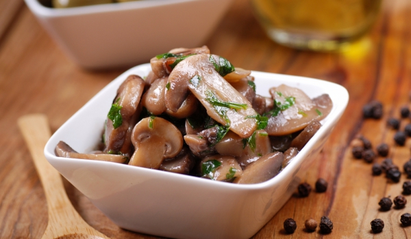 Предварително загрявате фурната на 220 градуса. Смесвате гъбите, листата мащерка, чесъна, оцета и зехтина в съд за печене и подправяте. Печете гъбите открити за около 20 минути, или докато омекнат....