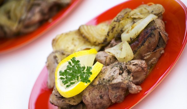 Дробът се почиства от ципите, разрязва се на едри парчета, поръсва се със сол и черен пипер, намазва се с олио и се пече на скара. Поръсва се с нарязан магданоз и се сервира с домати и краставици, на...