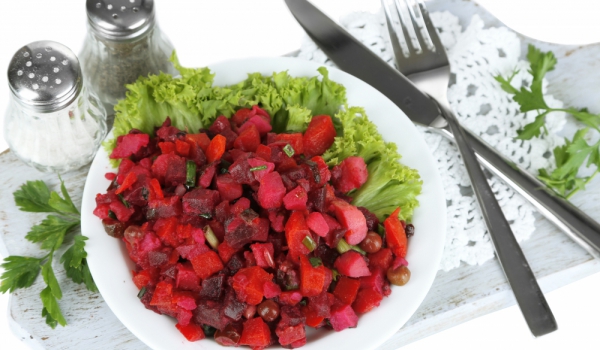 Загрейте фурната на 220 градуса. Отрежете листата от цвеклото и увийте всяко едно поотделно във фолио и сложете във фурната. Добавете и чушките, като отгоре леко ги намажете с мазнина. Печете около 30...