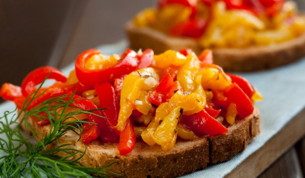 Изпечете филийките хляб и ги натрийте със скилидките чесън. Нарежете домата на 2 и изстискайте сока му върху брускетите. Изпечените и нарязаните чушки се разпределят върху хляба, поръсва се със сол,...