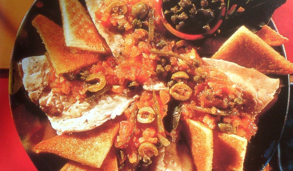 Пуешкото се нарязва на едро. Ментата и зеленият лук се режат на ситно. Джинджифилът се настъргва на ситно. Портокалът и лимонът се изцеждат. Чушките се нарязват на ситно. Всичко се смесва и се полива...