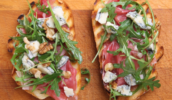 Нарежете филийките хляб. Натъркайте ги с чесън, полейте със зехтин и поръсете с малко сол и шарен пипер. Сложете ги в тавичка във фурната да се запекат. След като са готови, извадете и отгоре разпред...