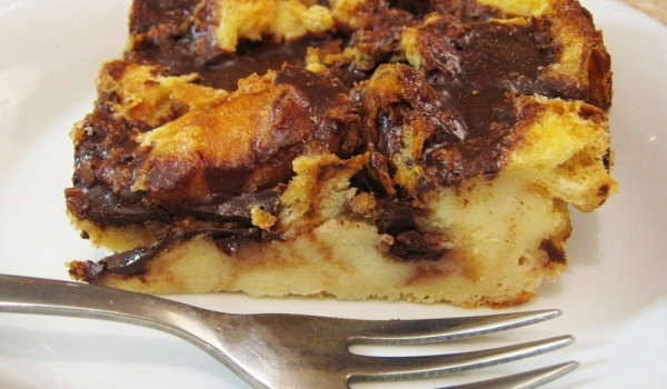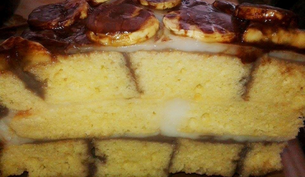 Надробения на парчета кекс се слага в малка тавичка. Добавя се нарязания на колелца банан. Яйцето се разбива със захарта и се смесва с млякото. Получената смес се излива в тавичката и всичко се объркв...