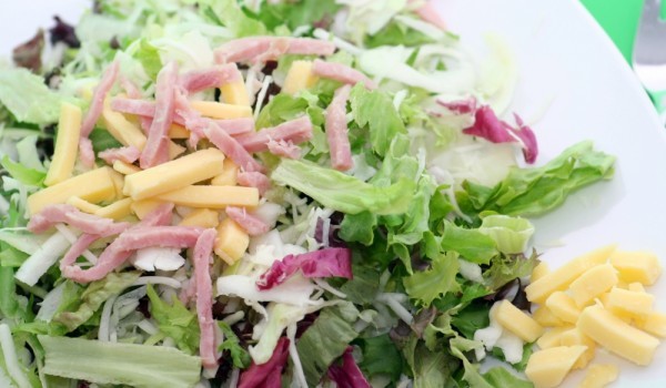 Почистете зеленчуците добре. Накъсайте марулите и Айсберга в голяма купа. Към тях прибавете нарязаните на тънки лентички кашкавал и шунка и леко разбъркайте. Пригответе дресинга за салатата, като ра...
