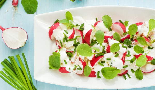 Репичките се измиват и се нарязват на тънки кръгчета. Яйцата се разрязват, жълтъците се отделят и се намачкват. Добавя се сметаната и солта и всичко се разбърква. Добавят се нарязаните репички. Белт...
