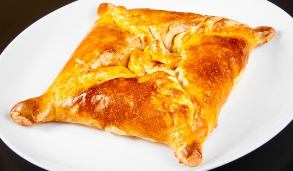 Тестото се разточва на кора с дебелина половин сантиметър и се разрязва на 10 квадрата. В средата на всеки квадрат се слага от плънката, която се приготвя от намачканото с вилица сирене, яйцата, смет...